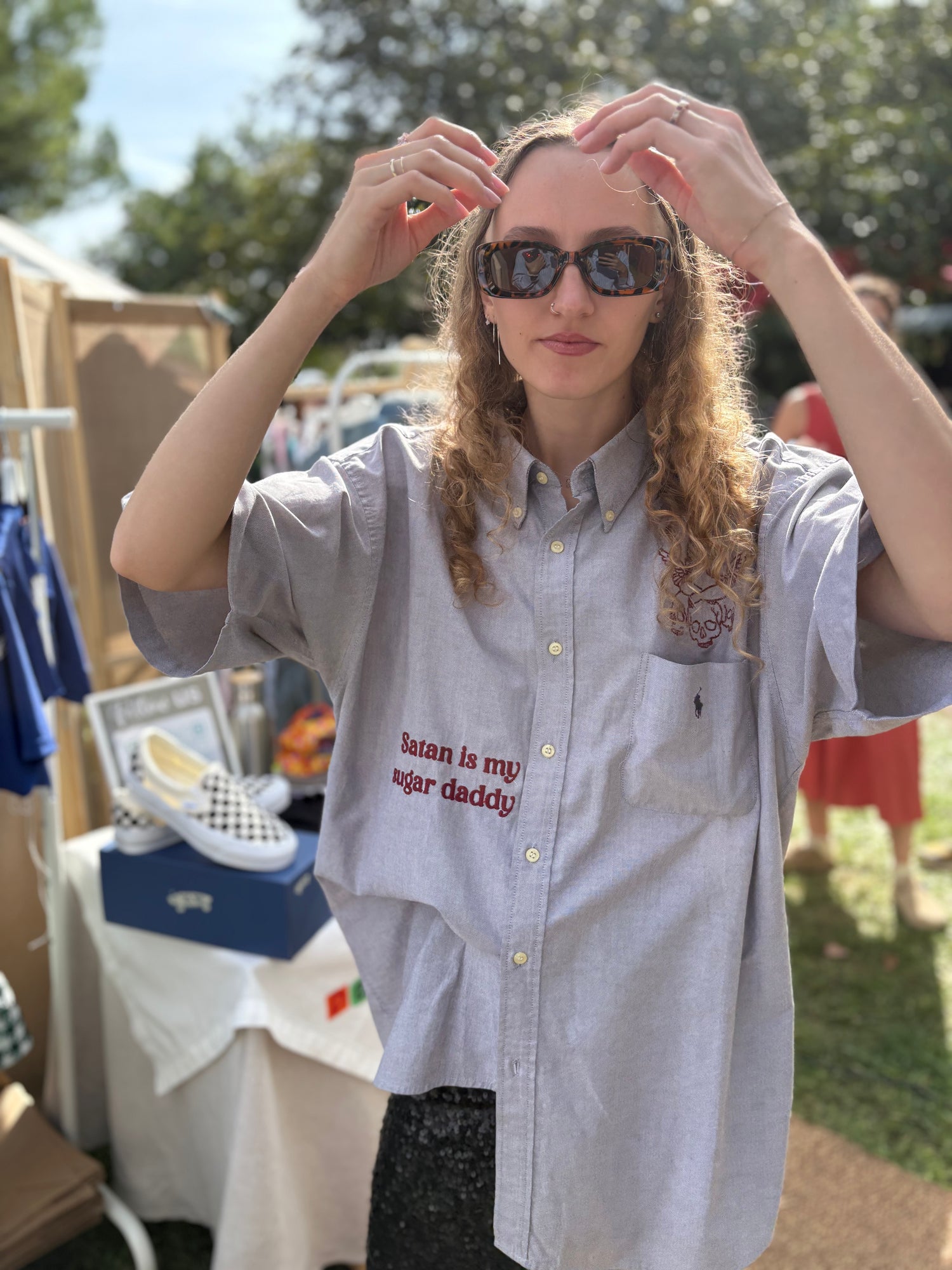 Camicie vintage rigenerate e personalizzate con ricami, inserti e dettagli colorati.