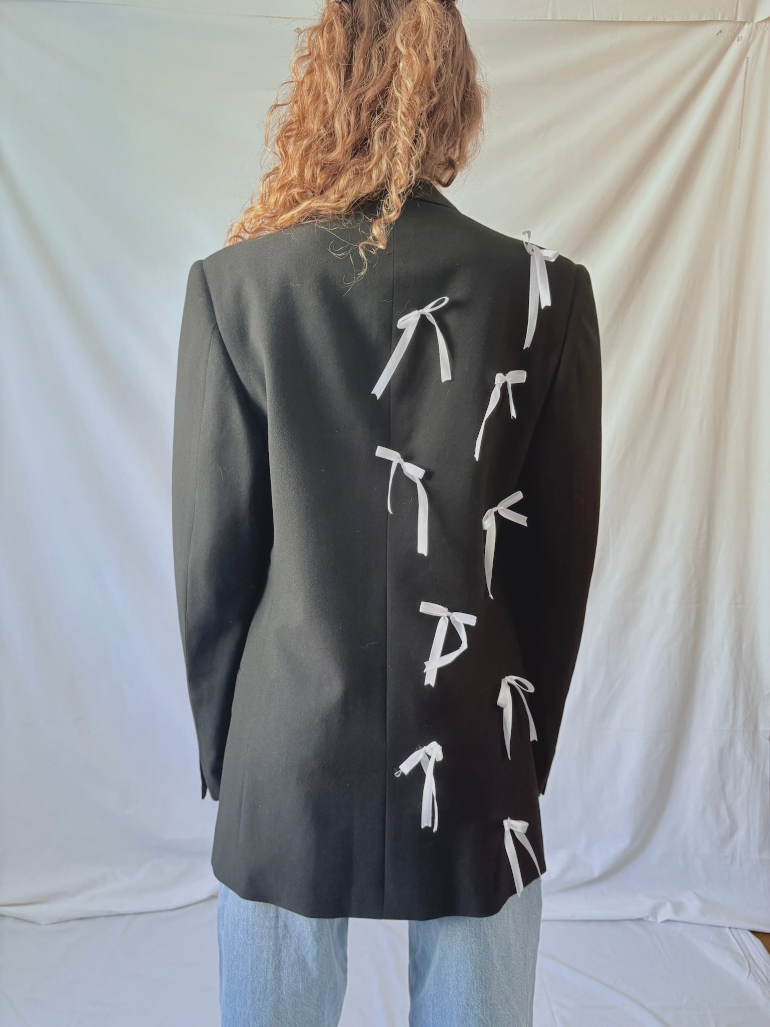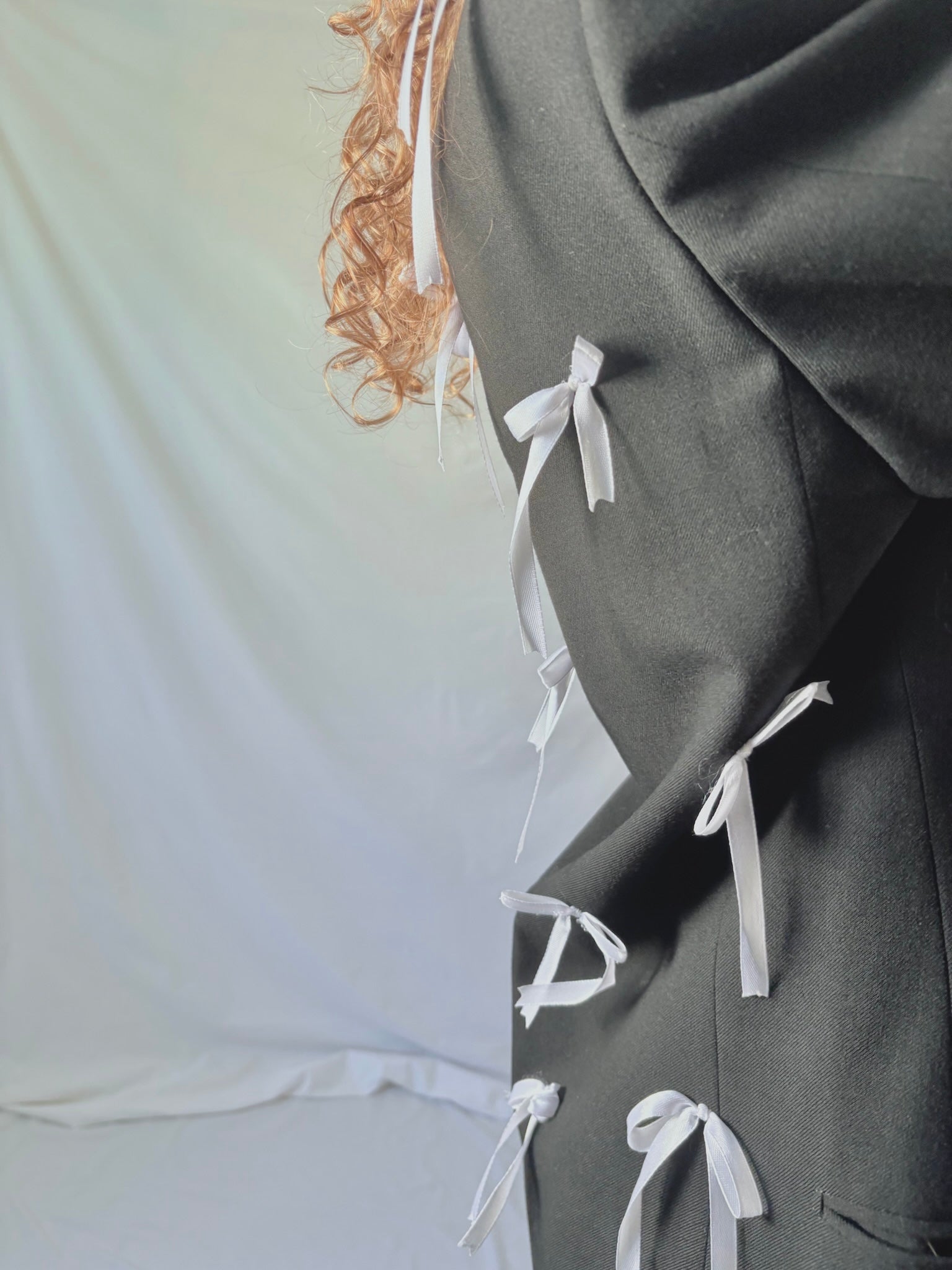 Rielaborazione cucita a mano con fiocchi bianchi.