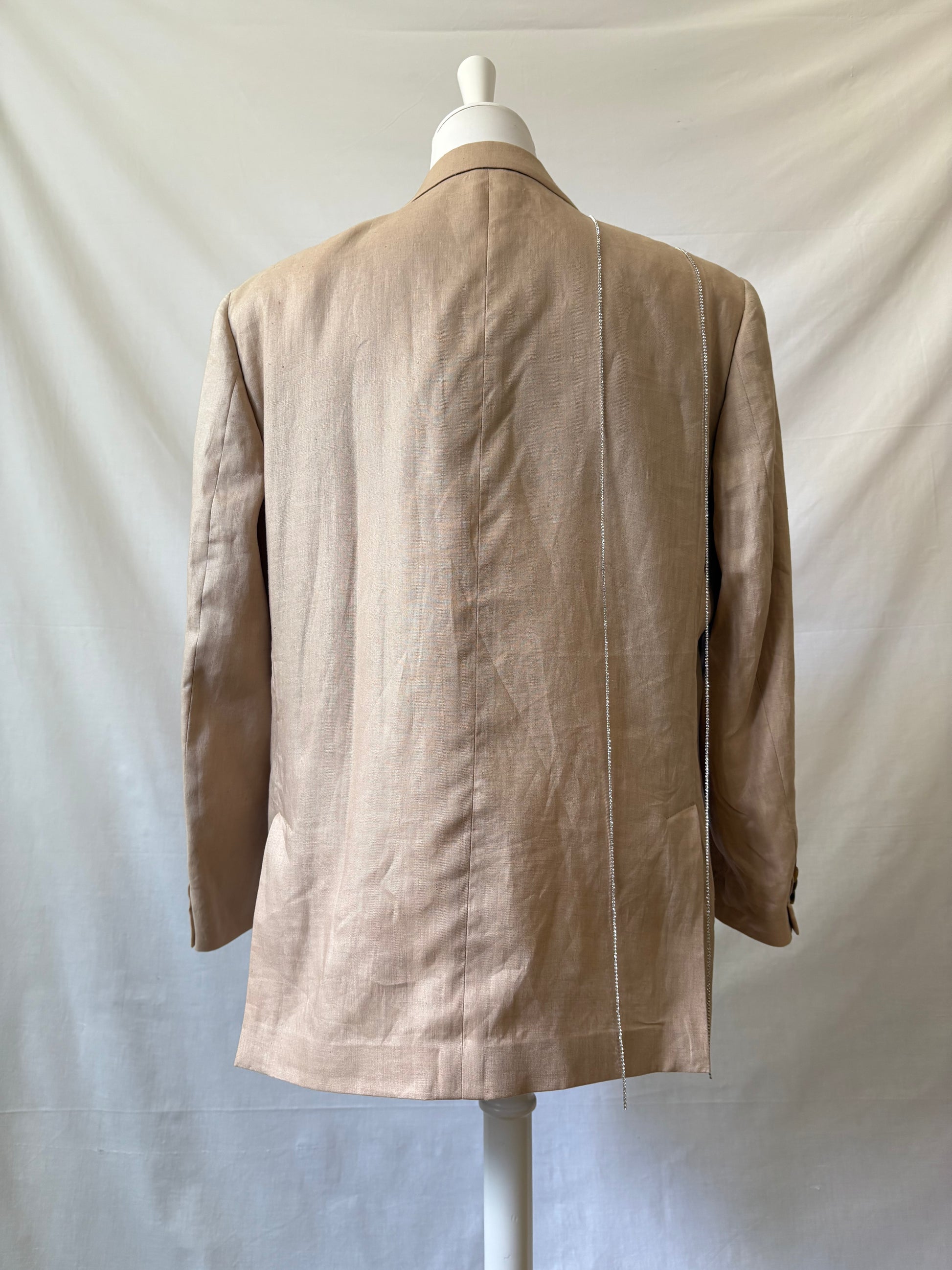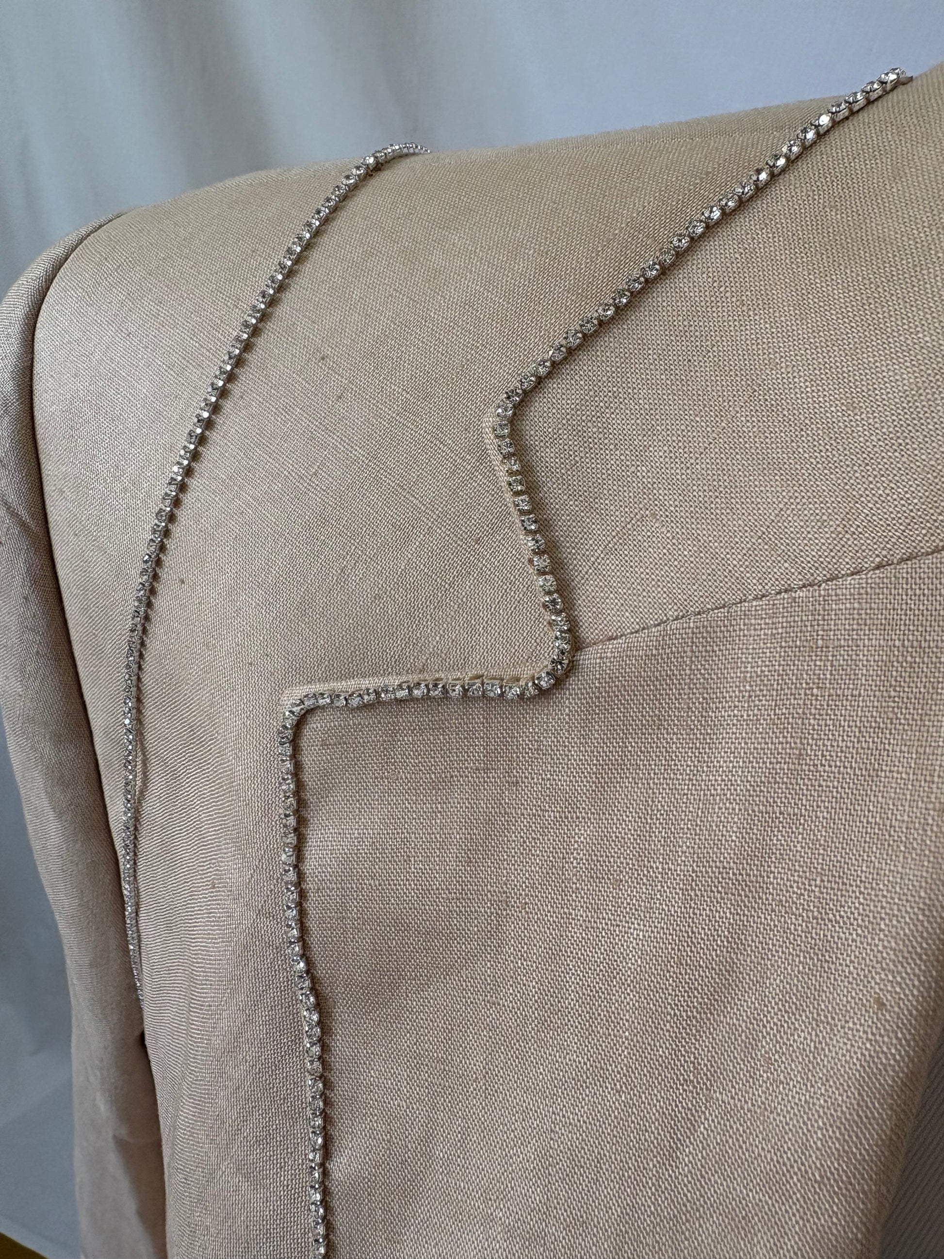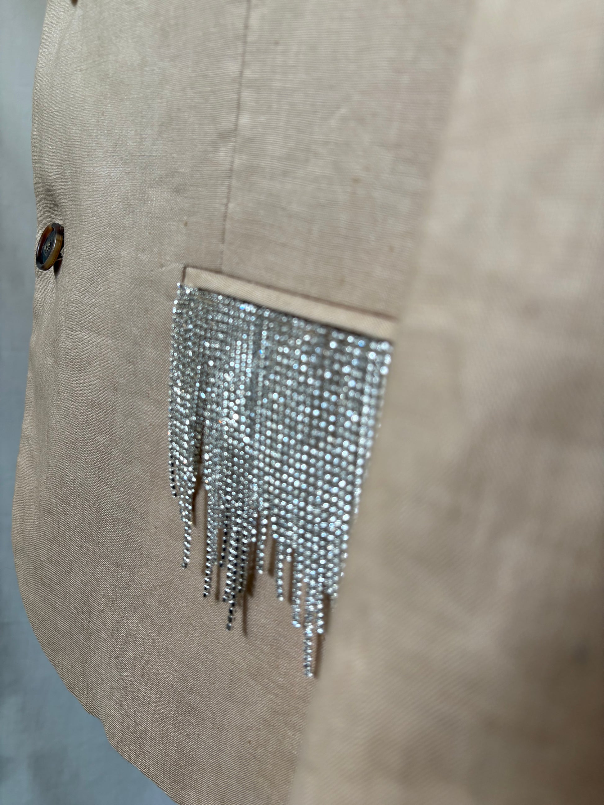 Sulla metà destra scorrono due raffinati fili di brillantini cuciti a mano. Piccole catene luminose invece coprono la tasca anteriore sinistra creando un effetto luminoso d’impatto.