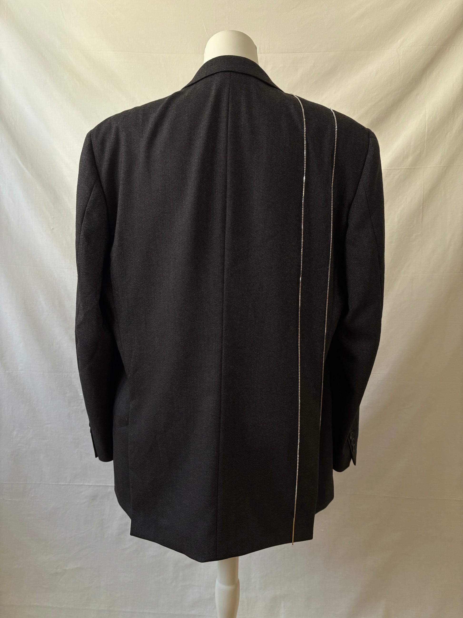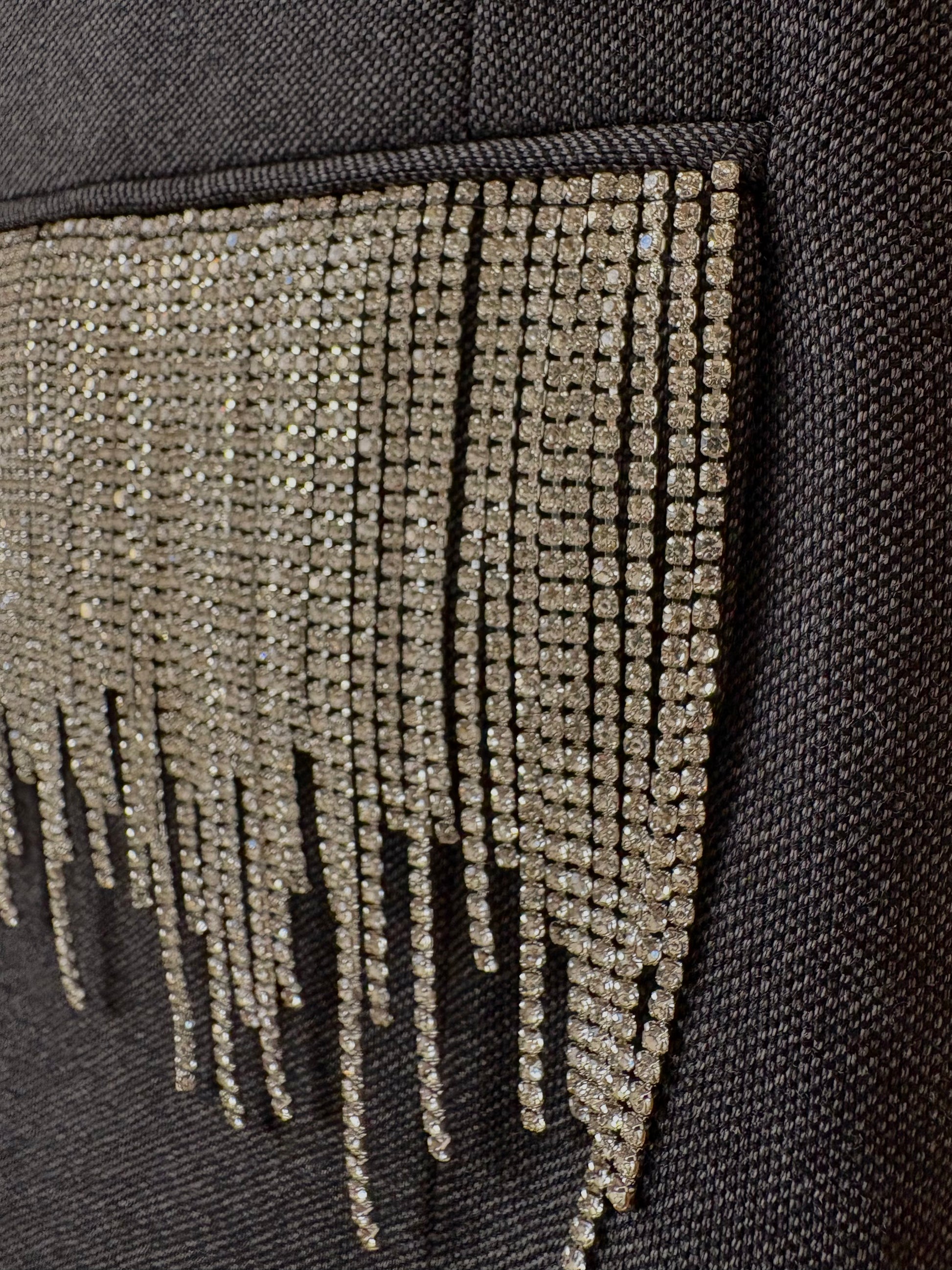 Sulla metà destra scorrono due raffinati fili di brillantini cuciti a mano. Piccole catene luminose invece coprono la tasca anteriore sinistra creando un effetto luminoso d’impatto.