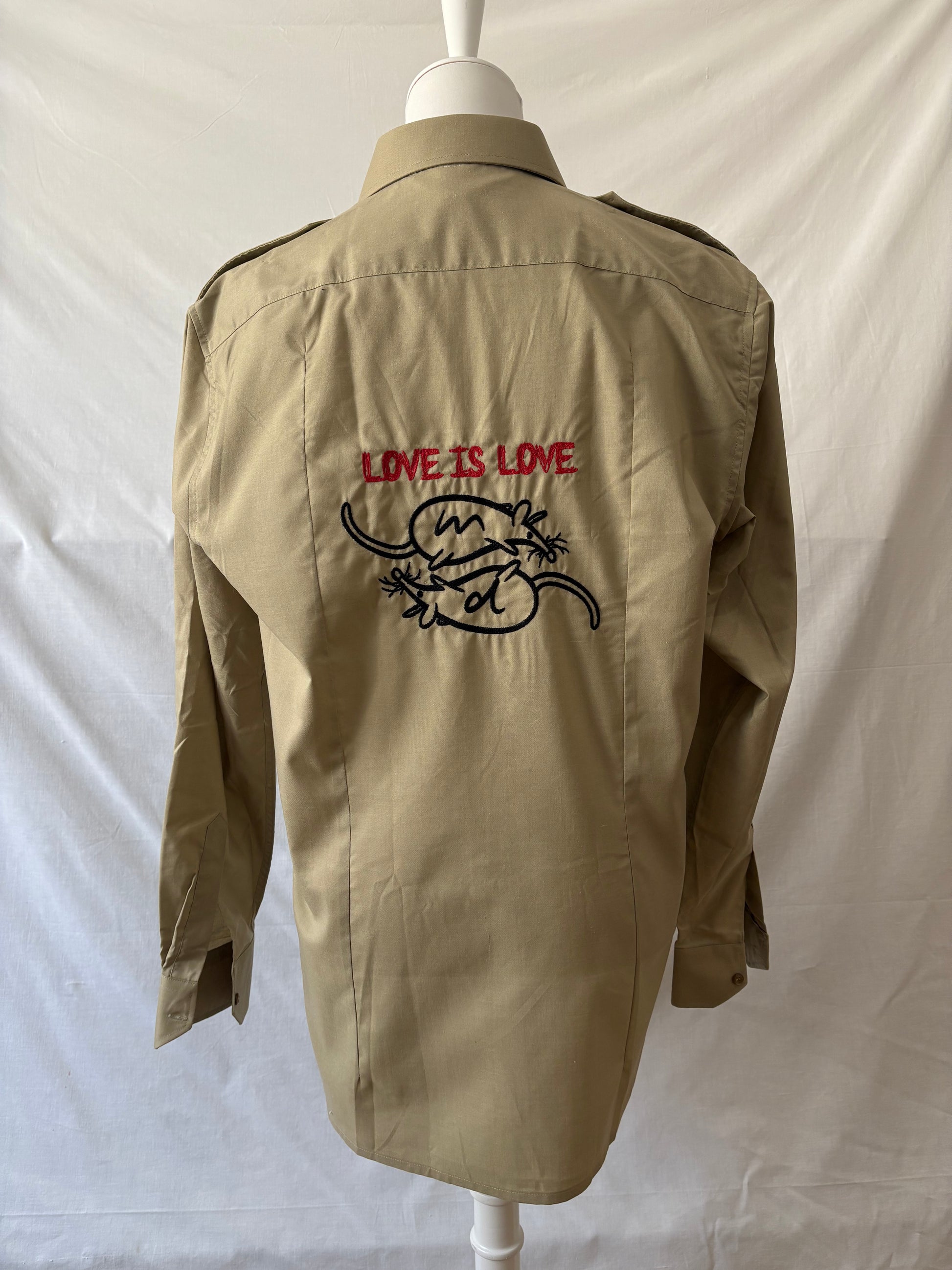 Rielaborazione ricamata con topolini e scritta "love is love"