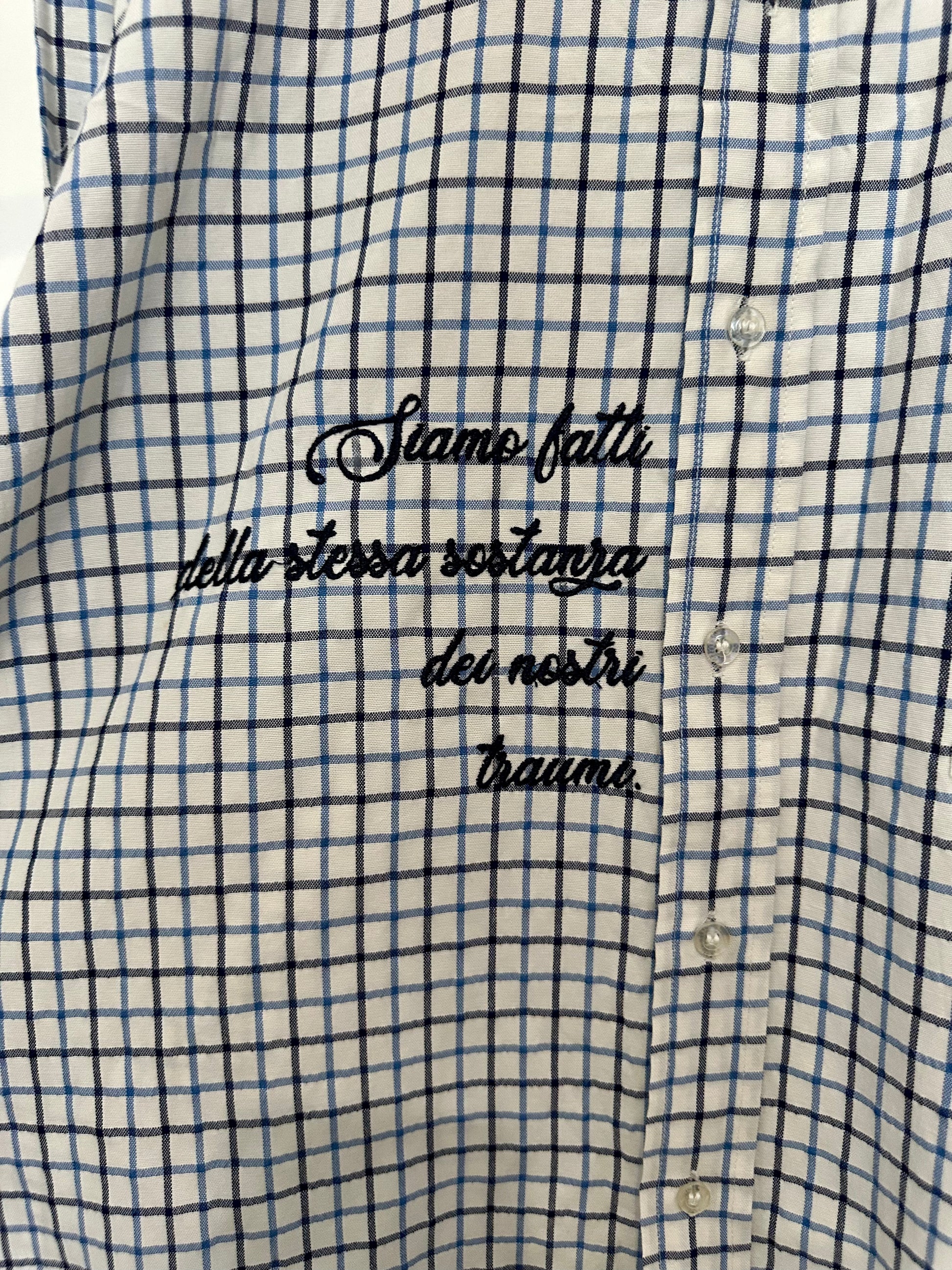 Rielaborazione con scritta "siamo fatti della stessa sostanza dei nostri traumi" e applicazioni sul fronte