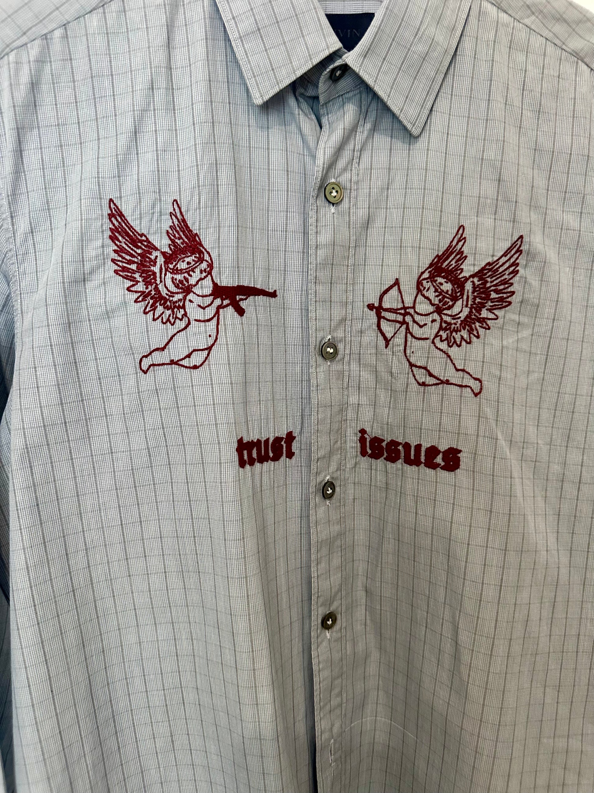 Rielaborazione con scritta "trust issues" e disegno angioletti sul fronte