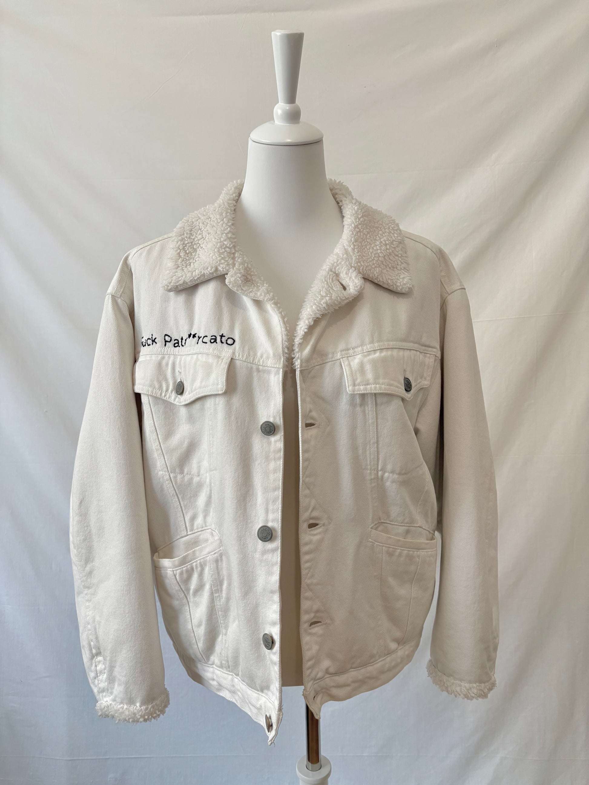 Rielaborazione realizzata a mano con scritta "no homophobia, no transphobia, no violence, no sexism, no abuse of power" sul retro e cucitura di scritta "fuck patr**rcato" sul fronte