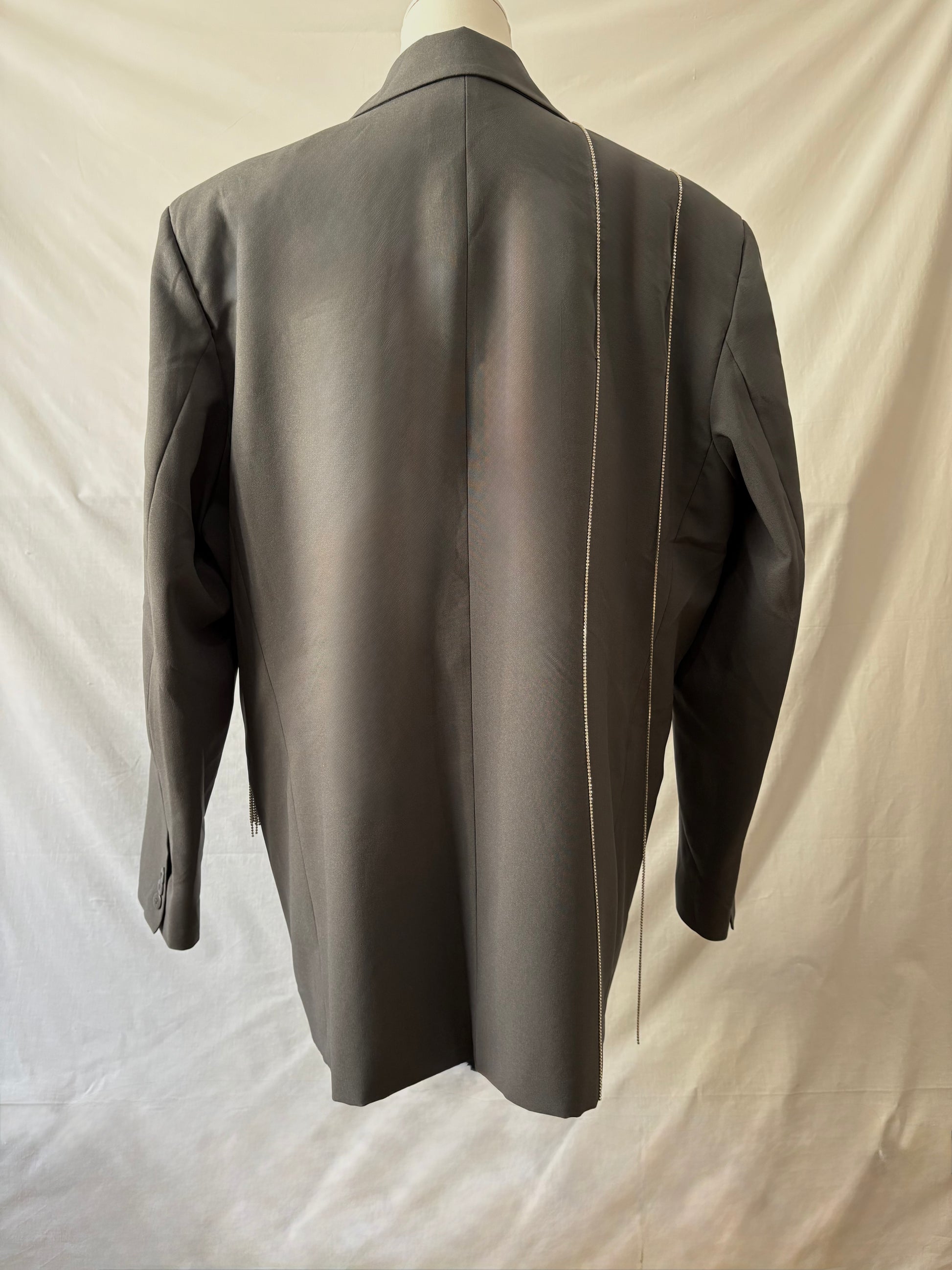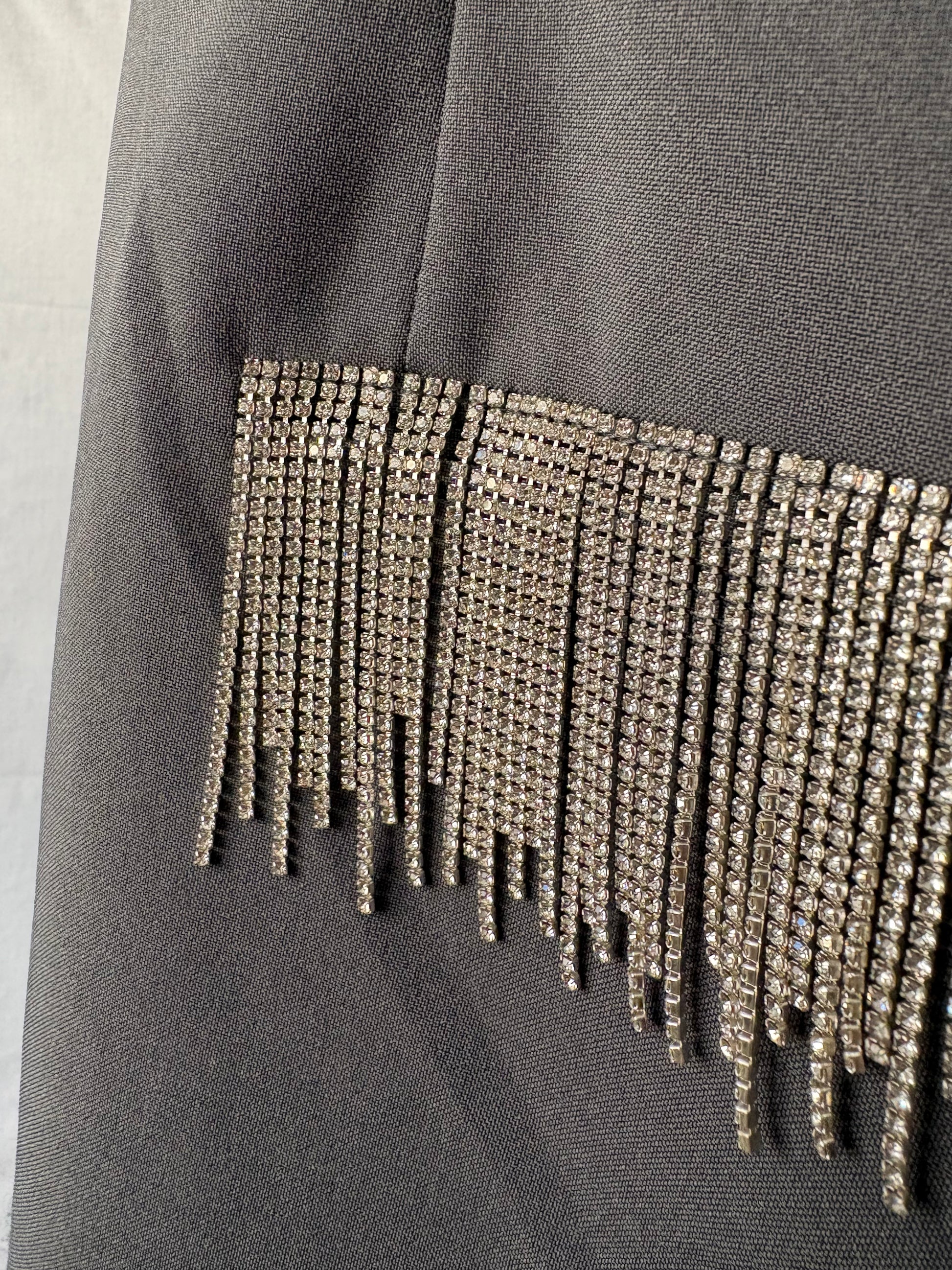Sulla metà destra scorrono due raffinati fili di brillantini cuciti a mano. Piccole catene luminose invece coprono la tasca anteriore sinistra creando un effetto luminoso d’impatto.