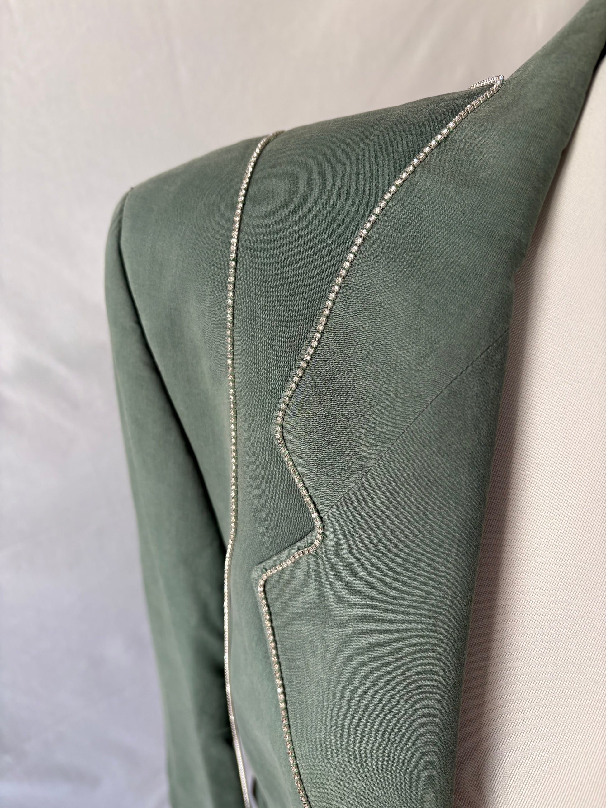 Sulla metà destra scorrono due raffinati fili di brillantini cuciti a mano. Piccole catene luminose invece coprono la tasca anteriore sinistra creando un effetto luminoso d’impatto.