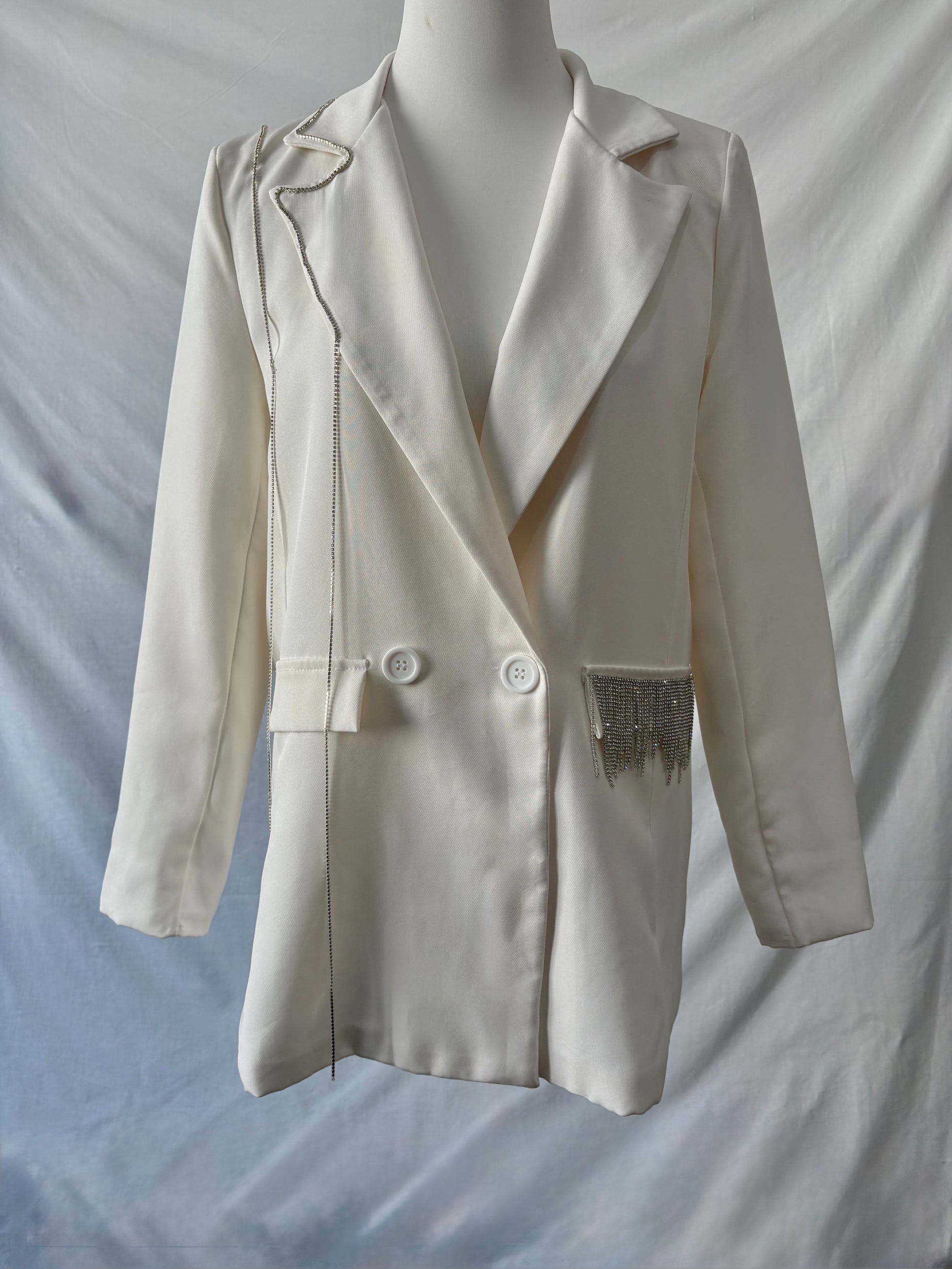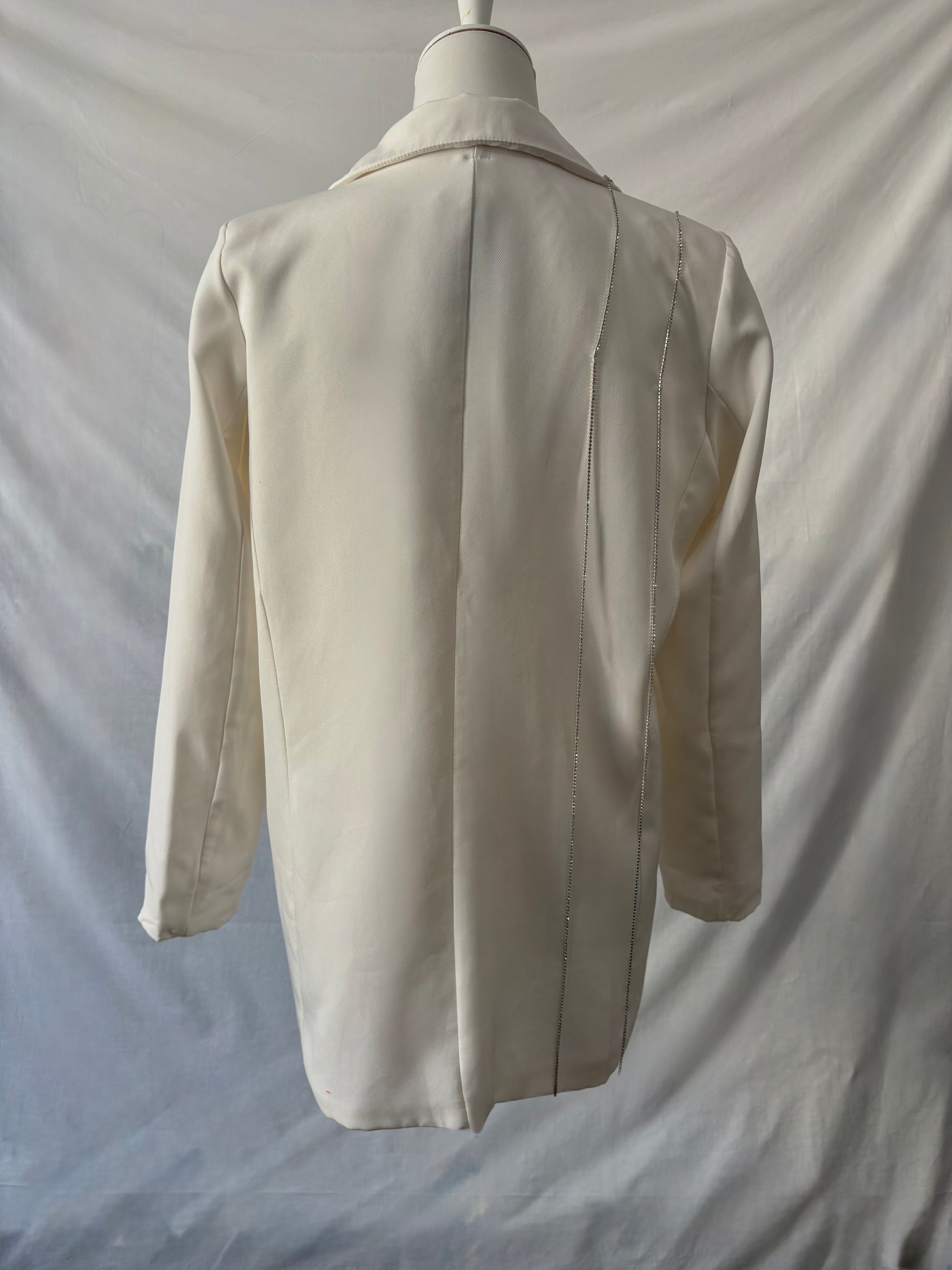 Sulla metà destra scorrono due raffinati fili di brillantini cuciti a mano. Piccole catene luminose invece coprono la tasca anteriore sinistra creando un effetto luminoso d’impatto.